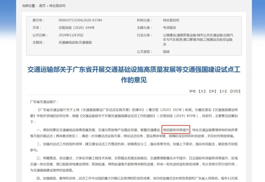 2020年10月10日,交通運輸部將“樞紐服務效率提升”列為廣東省承擔的全國交通強國建設試點任務之一,包括提升口岸通關便利化水平、提升白云機場國際航空樞紐輻射能力、提升港口智慧綠色發展水平三塊板塊。