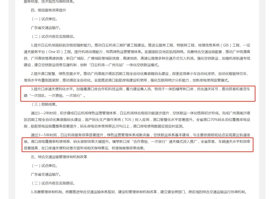 預期通過3—5年時間,實現白云機場服務效率顯著提升,綠色運營管理體系成熟完備,空鐵聯運體系基本建成,與主要鐵路樞紐站點實現直達軌道連接;港口岸電覆蓋率和使用率、碼頭裝卸效率大幅提升;橫琴口岸“合作查驗、一次放行”通關模式深入推廣,全省旅客、車輛通關水平和效率顯著提高,在口岸通關便利化等方面形成相關指導意見、標準指南等政策成果。